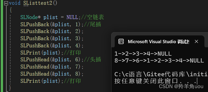 实际使用链表的时候我们不会像上面那样一个一个创建,初始时候是一个空链表,会跟顺序表类似进行空间开辟然后插入数据