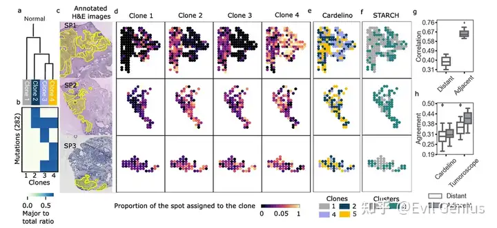 利用来自ST读取的体细胞点突变数据,从bulkDNA测序中重建的克隆基因型,以及苏木精和伊红染色(H&E)图像中注释的spot中的癌细胞计数来揭示肿瘤样本中每个spot的克隆组成。这种方法能够在空间上定位体细胞点突变和来自组织内DNA测序的克隆。