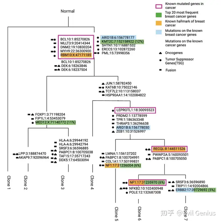 SNV可能发生在进化过程的后期,导致肿瘤镜发现的不同克隆的形成。