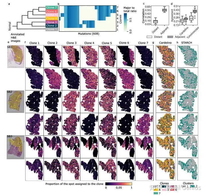 Tumoroscope对乳腺样本的空间克隆组成进行反卷积,并在不同的子区域内揭示克隆特异性的空间模式