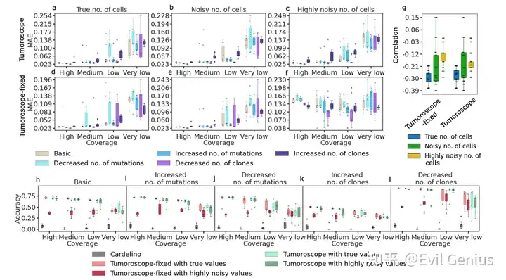 Tumoroscope可以准确地估计每个点的克隆比例,并对输入细胞计数噪声具有鲁棒性(模拟数据)