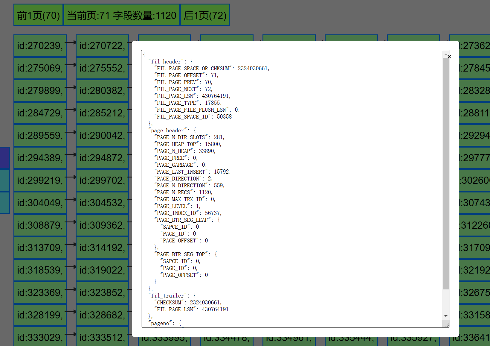 比如我们看到,这一页有1120个字段, page_level是1, 表示还有1层. seg_leaf之类的就没得了. 前一页是70, 下一页是72, 这是逻辑顺序(由于我们是连续插入的数据,所以大概率是也是连着的).