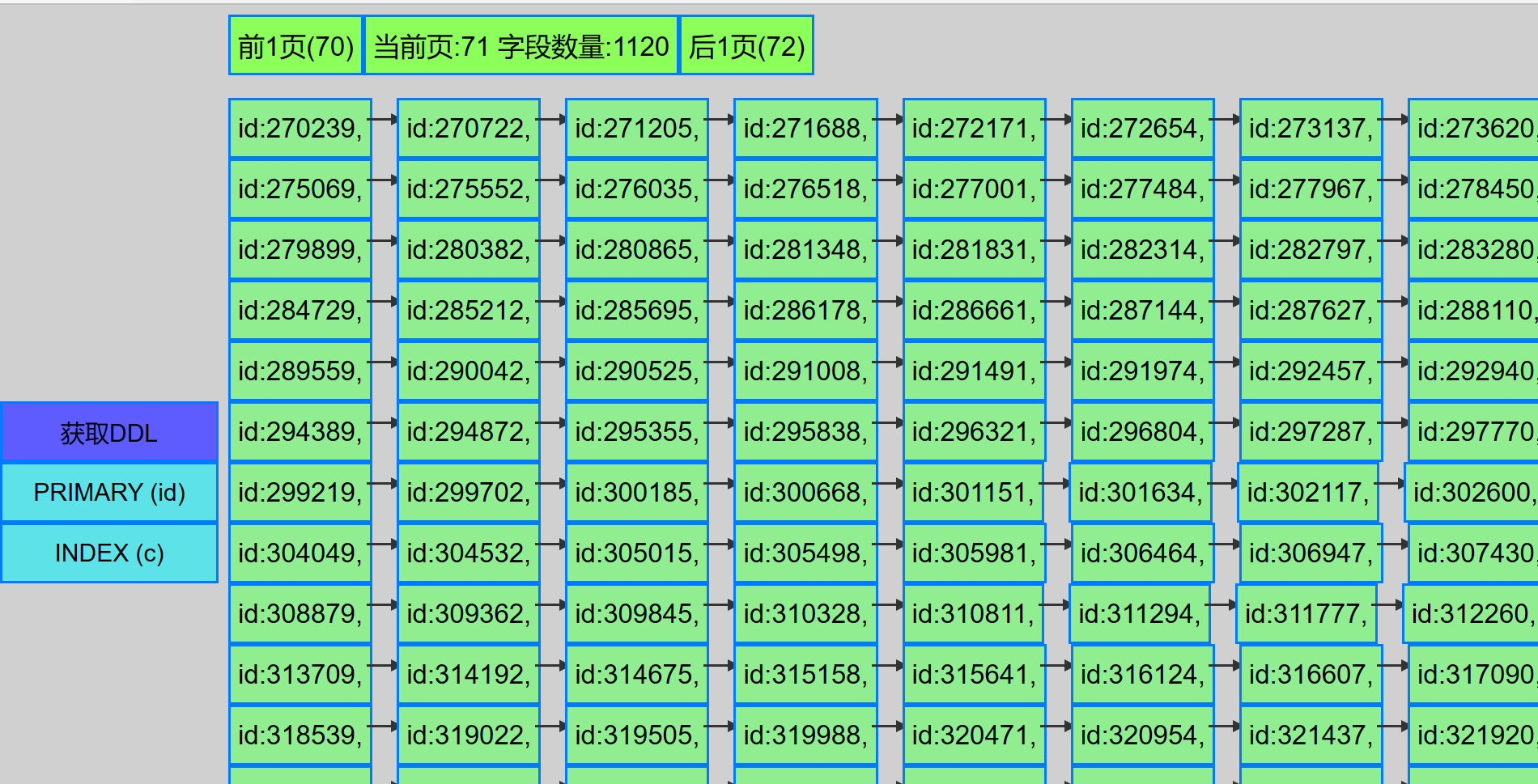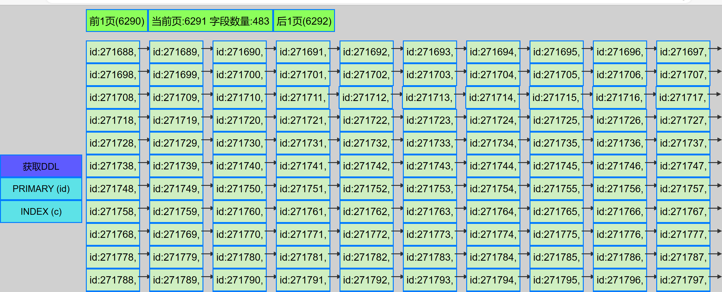 可以看到 主键是271689, 剩下2个字段(field)也是271689 (造数据的时候方便..)