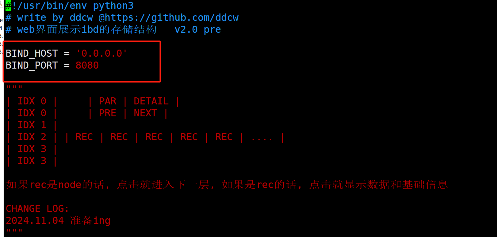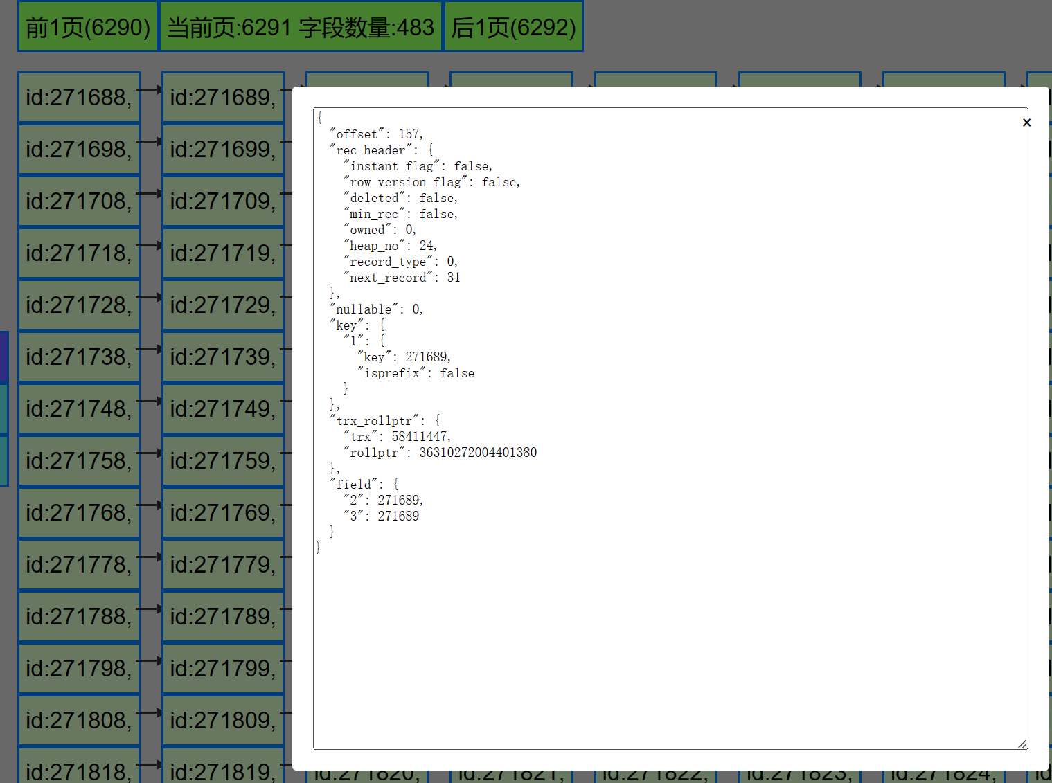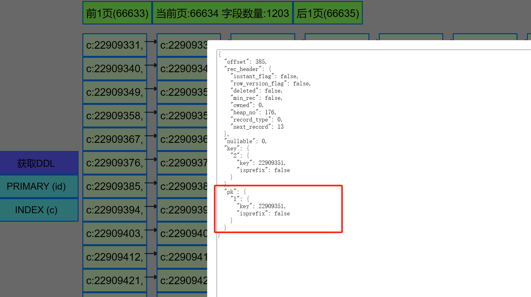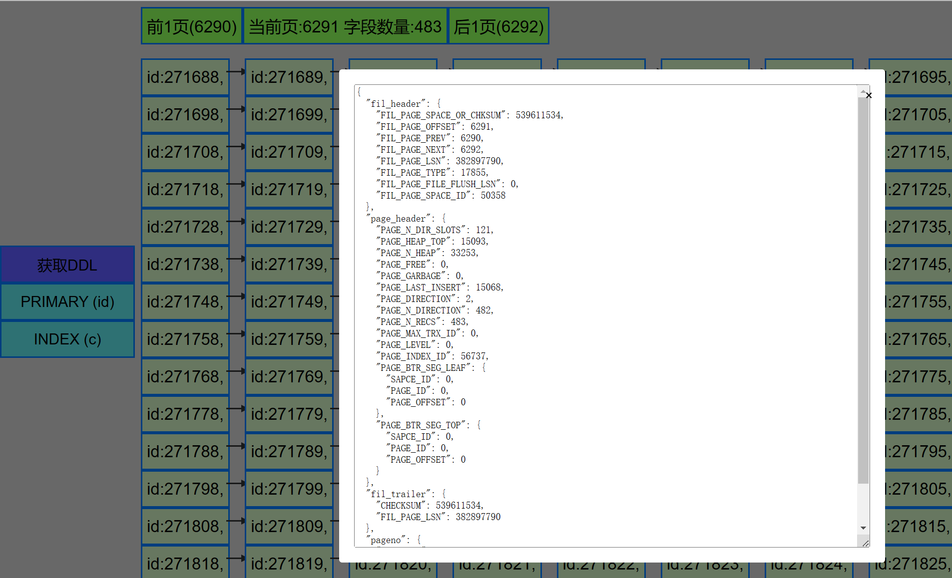 为了帮助理解mysql的数据文件在磁盘上的格式, 之前整了个解析ibd文件的工具, 但效果不太好--即使有DEBUG之类的功能,依旧不好理解. 于是就想着来个图形化的, tkinter就不错, 但这软件通常是运行在字符终端的, 而且服务端基本上都没得图形化的, 那就只能选择浏览器了. 于是就整了个可以在浏览器上查看mysql数据文件的工具.