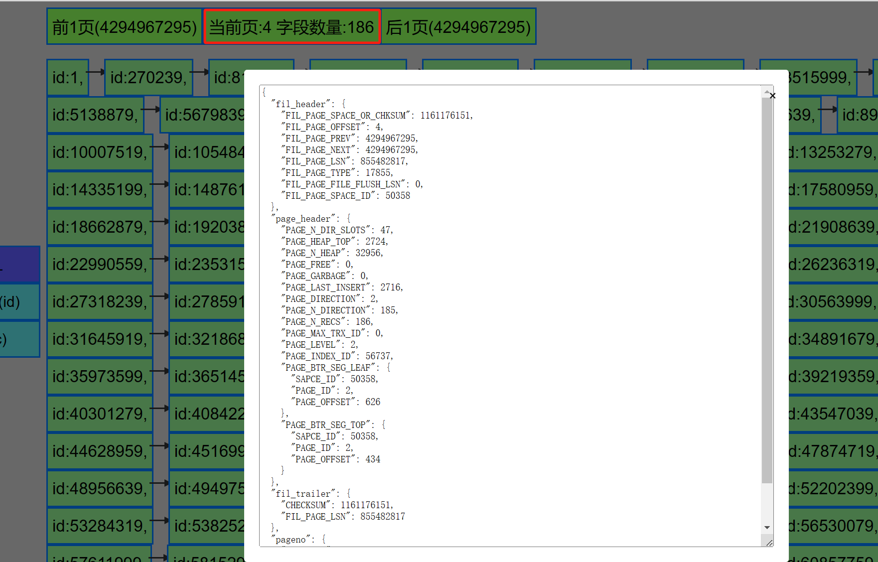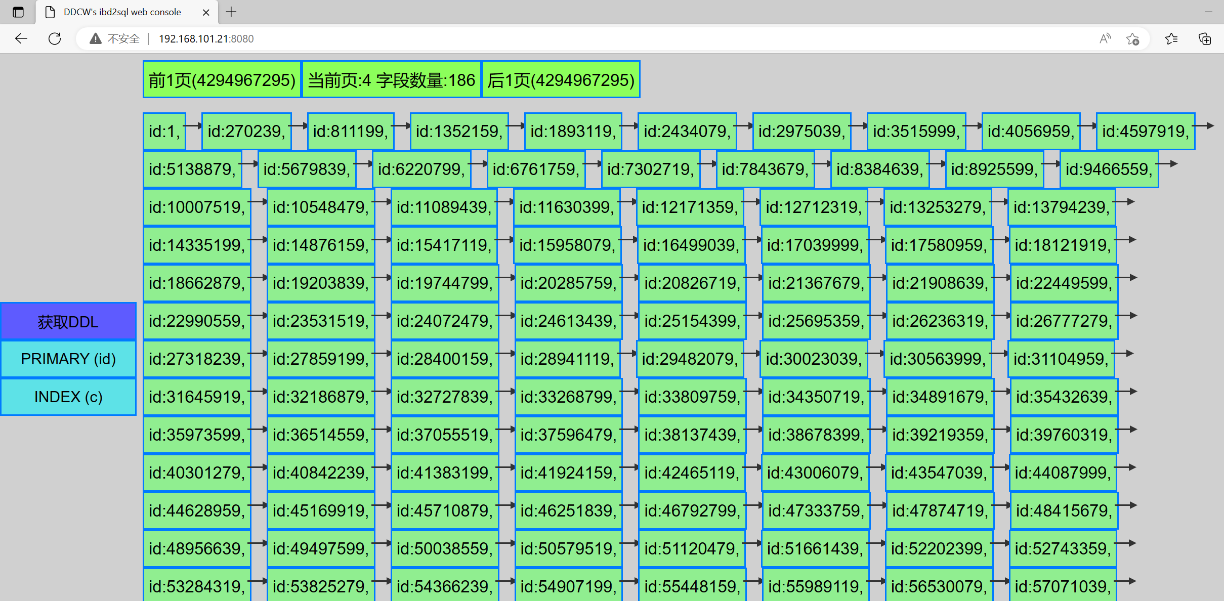 比如当前显示的就是主键的ROOT PAGE(页ID为:4, 有186条数据,即有186个二层节点). 没得上一页和下一页.