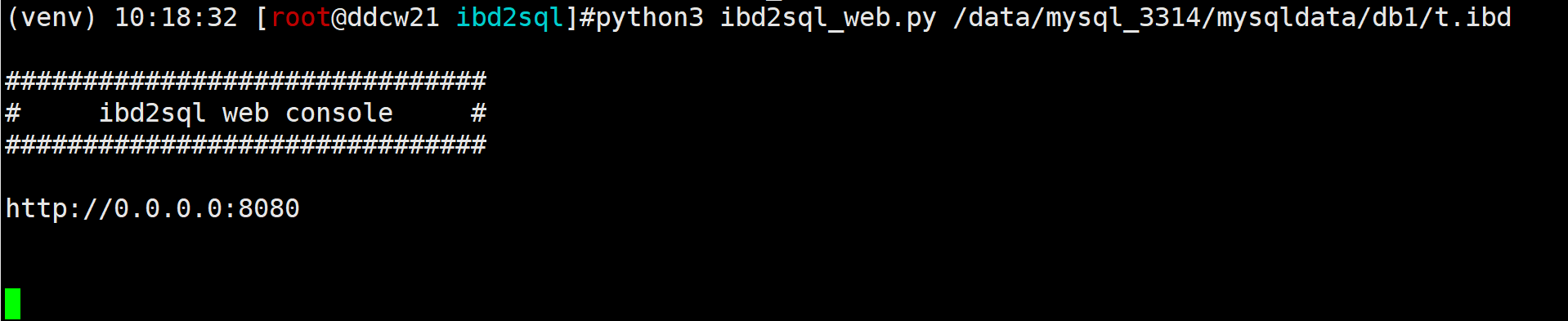 python3 ibd2sql_web.py /data/mysql_3314/mysqldata/db1/t.ibd然后就可以在浏览器上查看了. 默认是监听的0.0.0.0, 即可以使用任意端口访问, 若有特殊需求要更改监听地址或者端口的, 直接编辑脚本即可