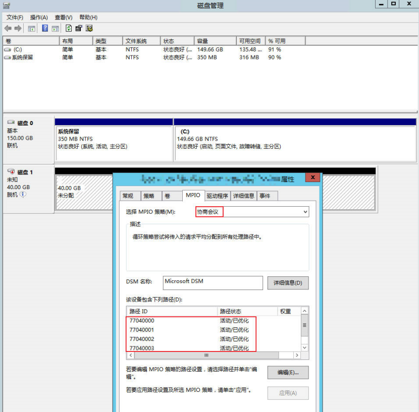 磁盘管理下,Windows主机映射盘,右键属性,“MPIO”页签,选中“MPIO 策略”为协商会议,即可在“该设备包含下列路径 (D):”中查看设置的多条访问路径。