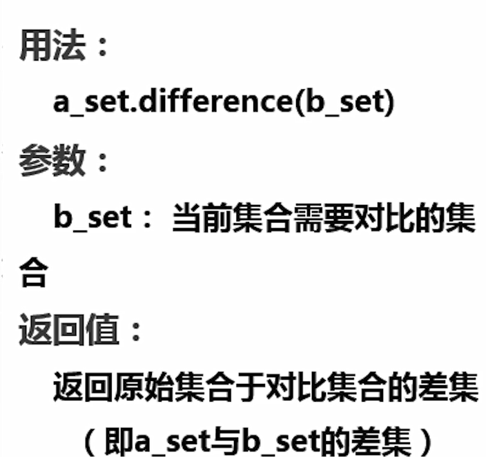 返回集合的差集,即返回的集合元素包含在第一个集合中,但不包含在第二个集合中。