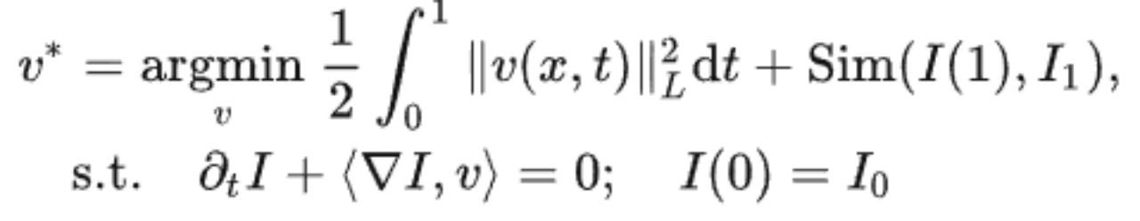 合合信息参考配准中的流模型(fluid model),用速度场来建模形变场,并通过积分层来实现最终的形变场。事实上,位移场也可以被视作是轨迹固定的流场(直线)。对于不同的正则项,在大部分情况下,直线轨迹并不是最优解。直线轨迹得到的正则项的值很多情况下会更大点。作为对比,引入速度场在这种情形下实现了更多的自由度。我们可以通过一个简单的类比理解这一问题:连接世界地图上两个地方的最短路径,大部分情况下都不是直线。速度场求解可转换为如下问题,其中L是对速度场施加的正则项。