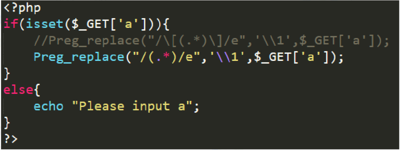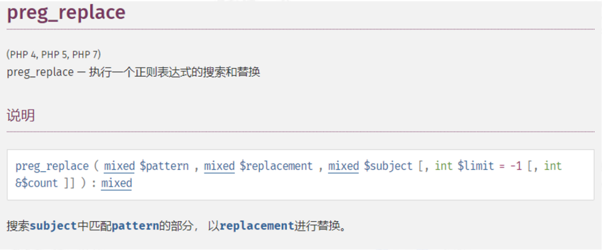 pattern : 要搜索的模式,可以是一个字符串或字符串数组。当pattern处存在一个“/e”修饰符时,$replacement的值会被当成php代码来执行。