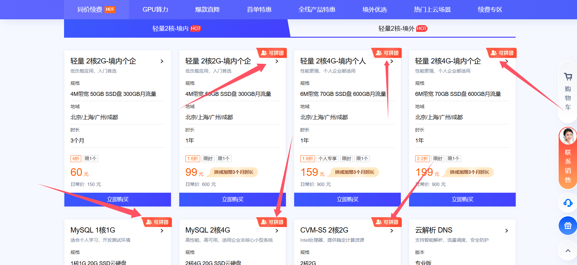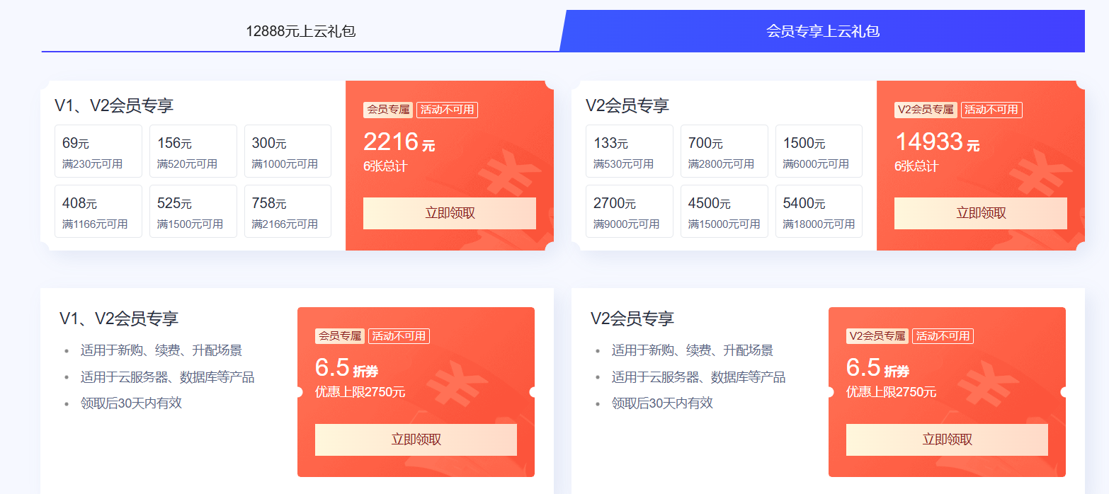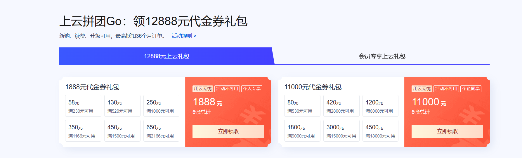 除了拼团活动以外,腾讯云还为大家准备了代金券礼包,不论是个人用户还是企业用户均可领取,可以用于新购、续费、升级服务,最高可以抵扣36个月订单。