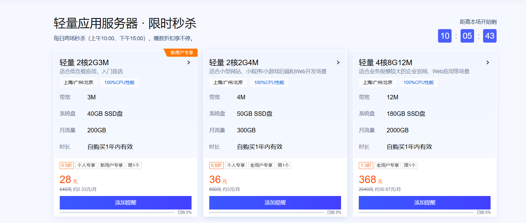 轻量应用服务器在双11活动中,每日两场秒杀(上午10:00 、下午15:00),爆款折扣享不停。对于新人用户,只需28元即可购买到一台服务器,折合下来每月仅需2.33元,极具性价比。