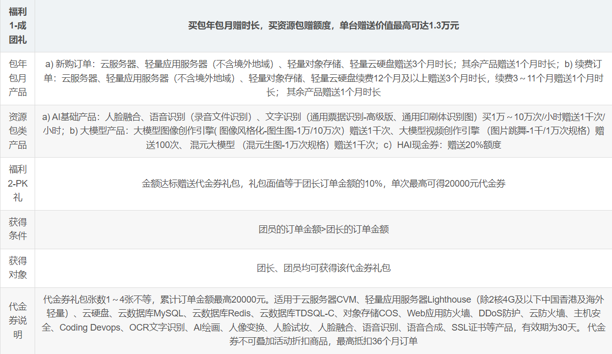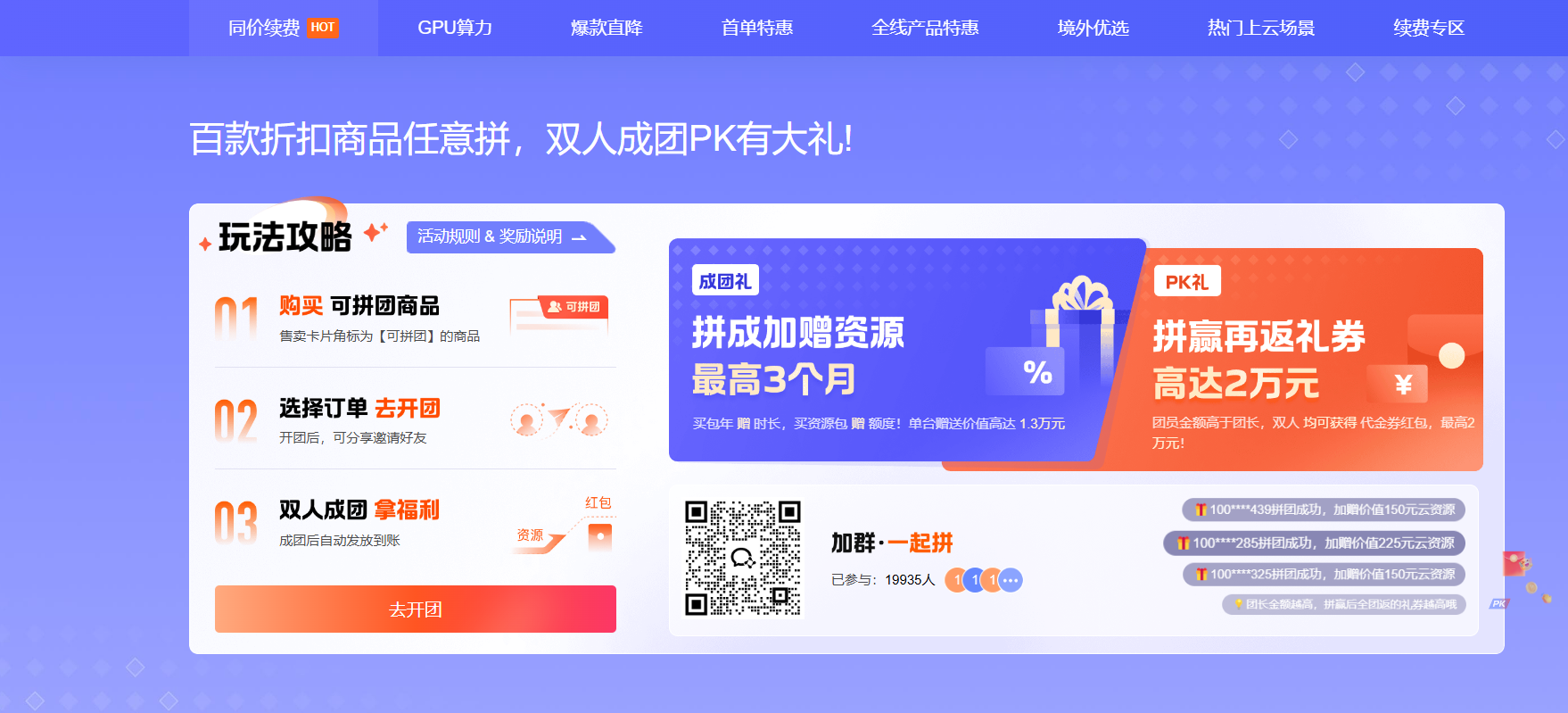 购买双11的活动商品,享受一重好礼:全年最优折扣! 选择含“可拼团”商品订单去拼团,成团享受二重好礼(成团礼):赠送最高3个月的时长,或者多拿10%的资源包。 小技巧:您可将多个商品合并下单去拼团,这样只需要去发起1次拼团,则每个”可拼团“标签的商品都能享受赠送 团长团员金额PK,享受三重好礼(PK礼):团员的订单金额高于团长的订单金额, 两人均可获得最高2万元的代金券。小技巧:开团金额越高,且邀请到的团员够“土豪”,双方均能获得更大代金券礼包!如有多个订单,建议选择金额略大于团长的订单来参团,更大金额的订单去开团,有机会返更多! 例如:小A想买多台云服务器、数据库、硬盘、AI等产品。他可先在双11活动购买 1.x~4.x折不等的商品,然后合并为一个订单去支付(假设支付金额为5000元)开团。 接下来小A邀请了其“土豪”好友小B下单超过了5000元,小A就可以拿到额外的500元代金券(即小A开团金额的10%)。同时小A的云服务器、AI等产品,可以对应获得赠送时长、资源包!