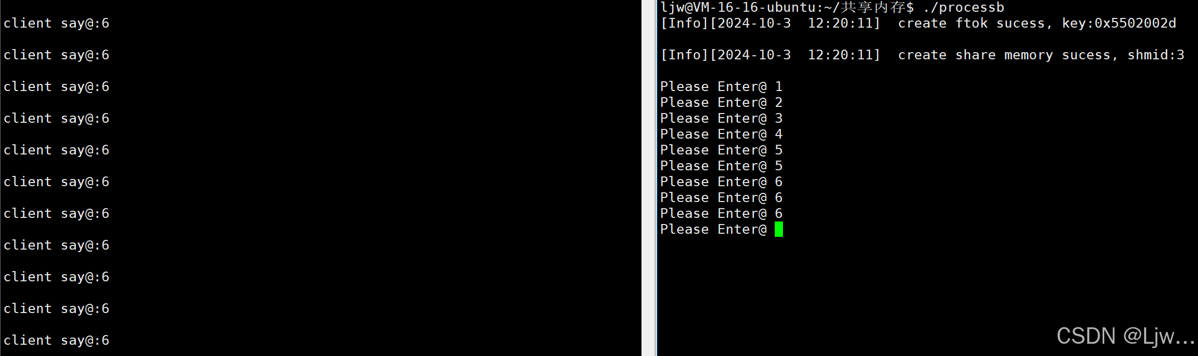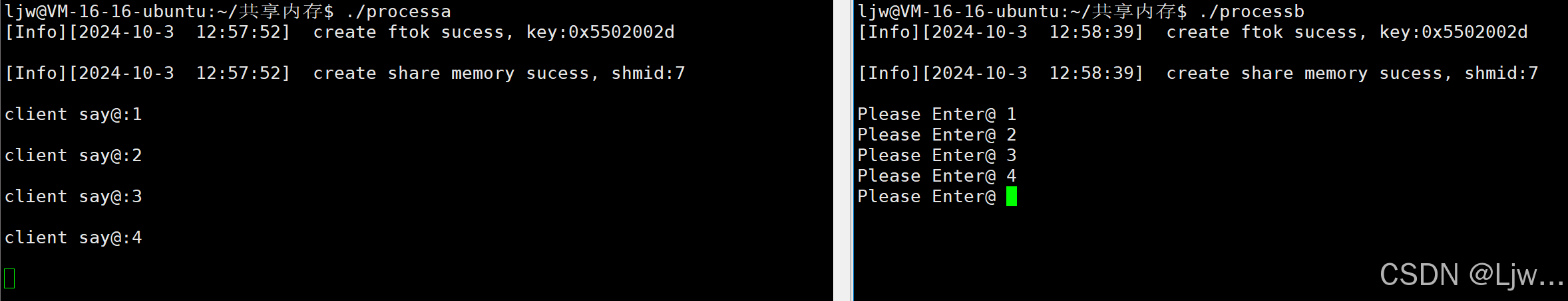 测试:先a运行,创建好共享内存,但阻塞了,等b输入