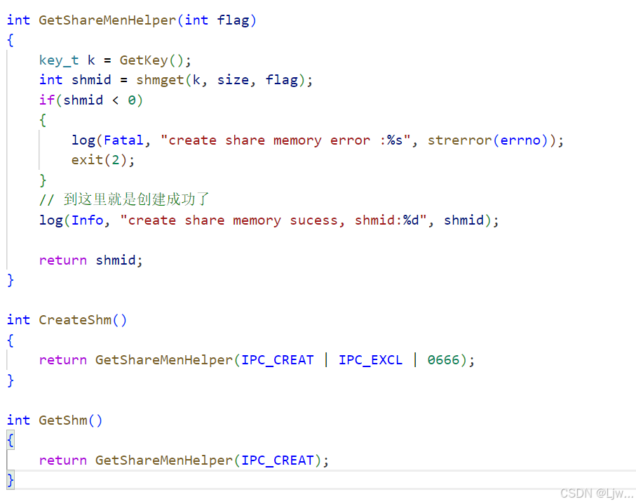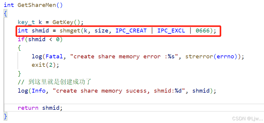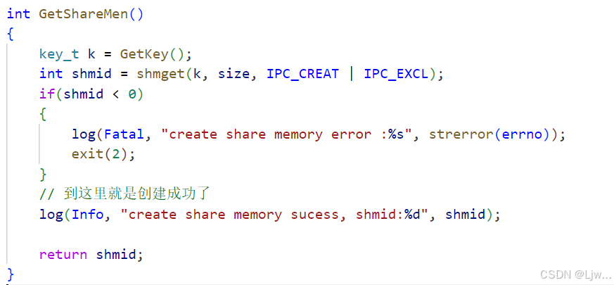 GetShareMem,key有了,共享内存也创建成功了,创建成功返回共享内存的标识符 ,失败-1返回,创建一个全新的共享内存