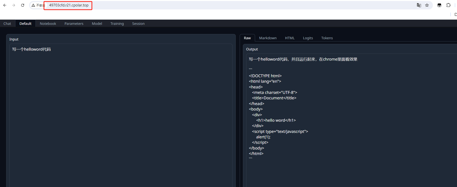 我们接下来使用http公网地址访问,可以看到我们访问到了 Text generation Web UI 界面,这样一个公网地址访问就创建好了。