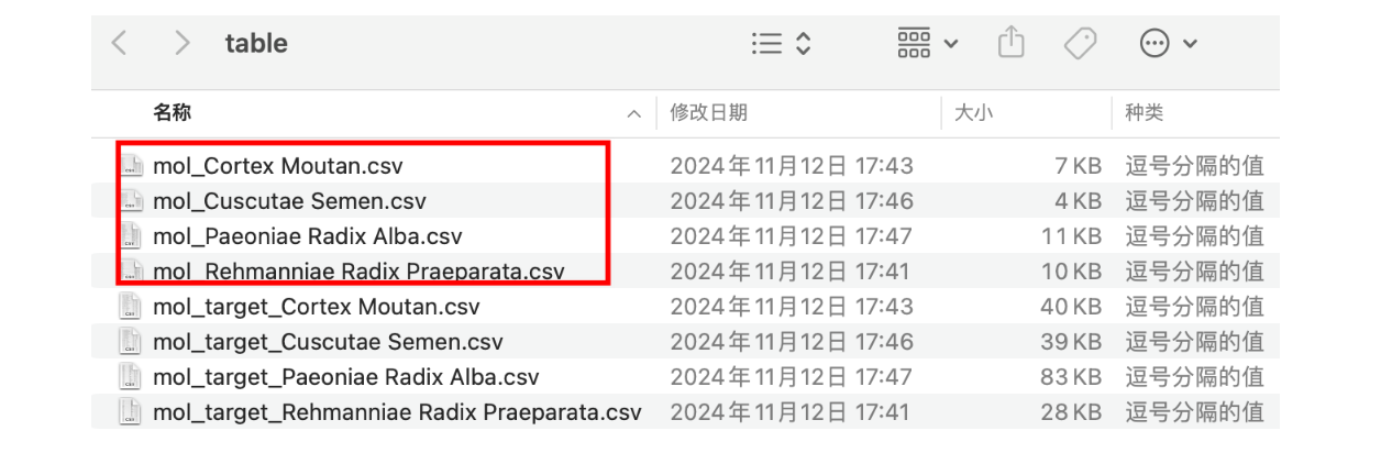 molecule.csv中包含所有中药满足OB(口服利用度)>30,DL(drug-likeliss,类药性)>0.18的小分子,target.csv中包含这些小分子的所有靶点。