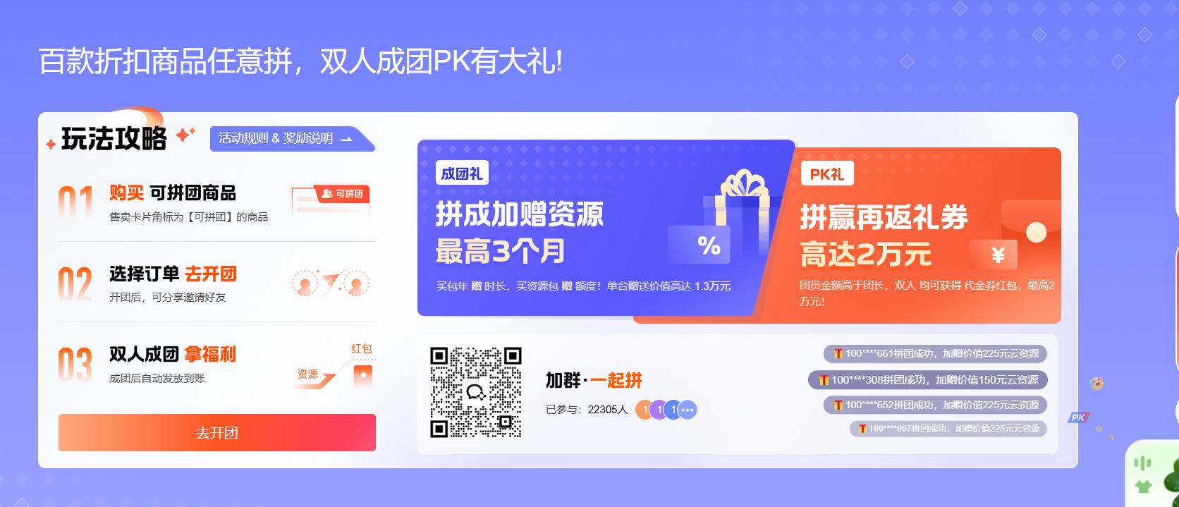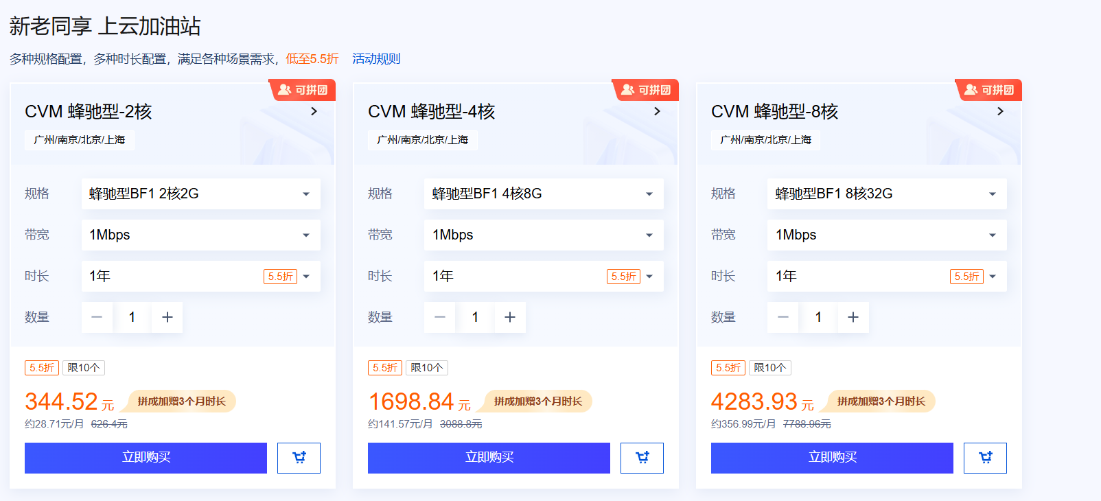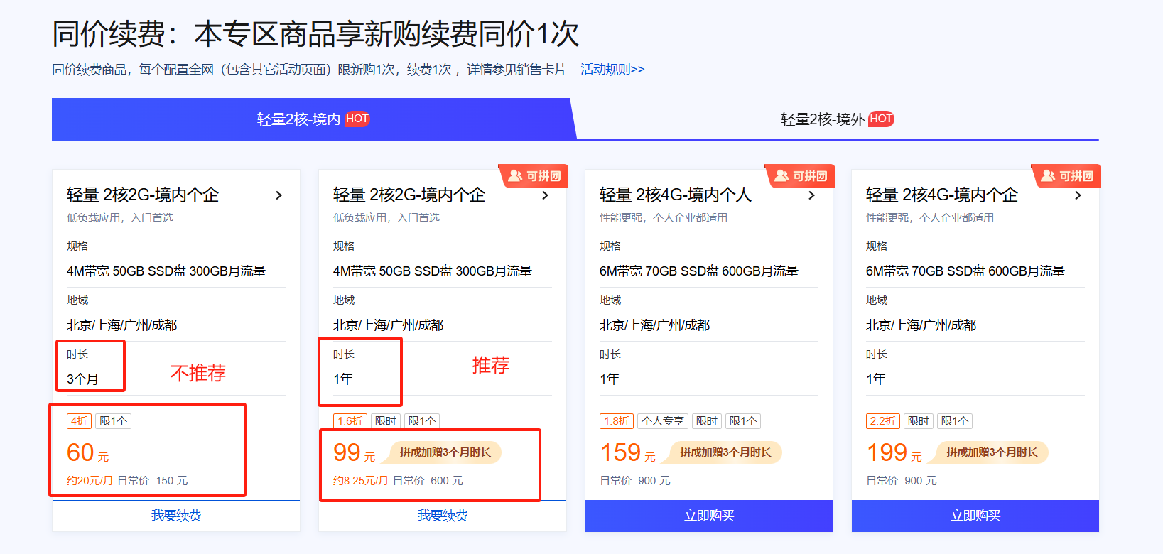个人感觉第一个的性价比很低,2核2G推荐选择第二个加上好友组队12+3=15个月花了99加上前面36元买的一共135元可以使用27个月(差不多2年3个月)个人还是很推荐的。