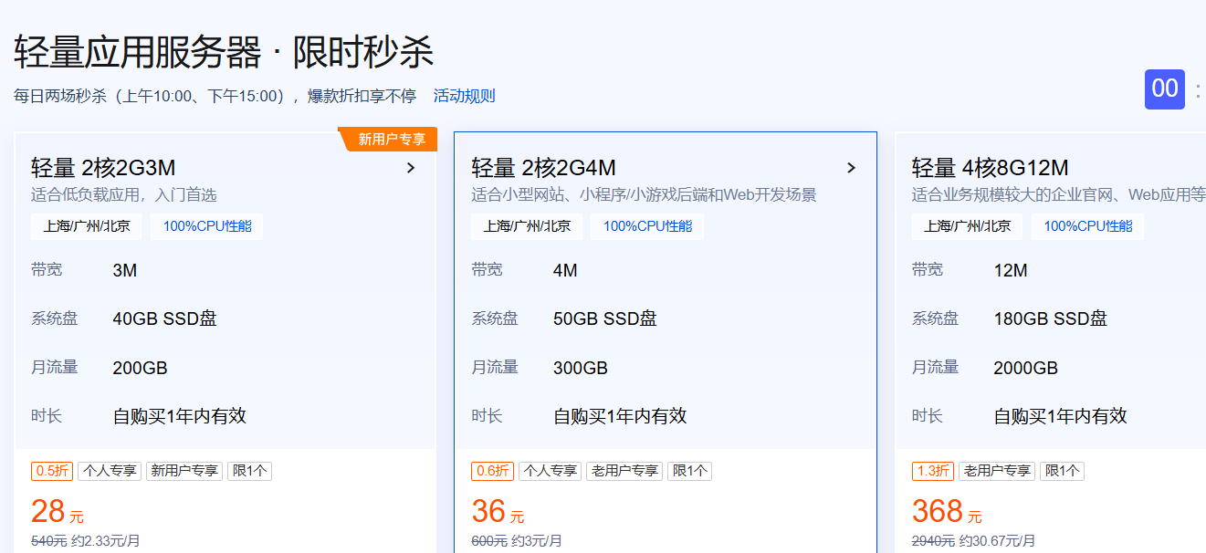 首先如果你是新用户,推荐参加轻量应用服务器秒杀活动,大家可以蹲一蹲,目前每天上午10点和下午3点,新人只需28元就可购买一台,折合每个月2.33元,就可以购买一年的2核2G3M的轻量应用服务器。