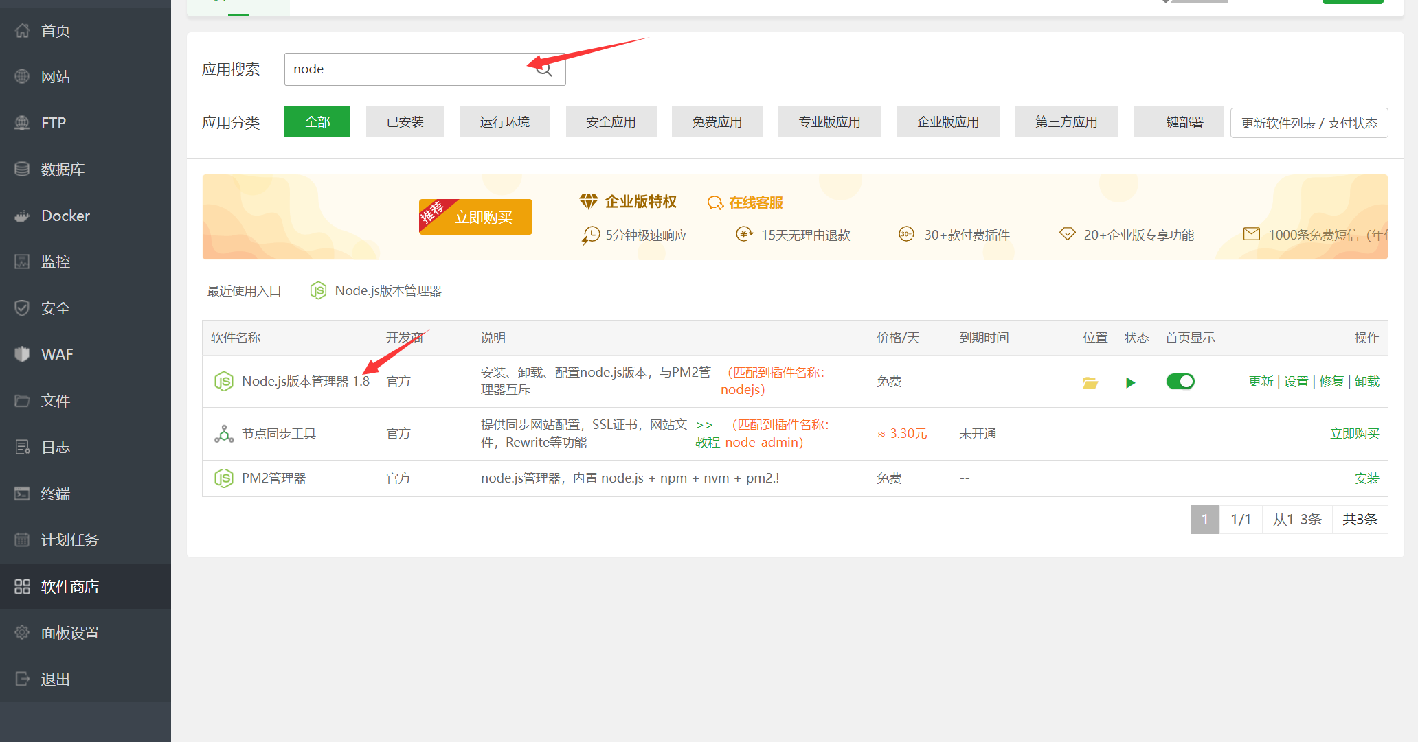 如果没有安装node,可以使用宝塔安装(推荐),进入软件商店,搜索node,选择node.js版本管理器1.8进行安装: