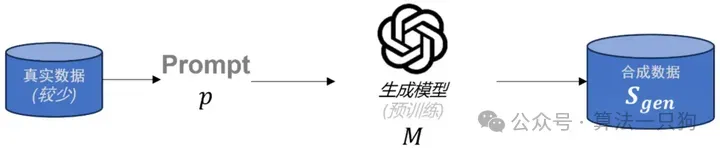要生成高质量的数据,目前常用的方法是通过一个在相关内容上进行过预训练的大语言模型生成合成数据。具体来说,生成过程通常是基于少量的真实数据,编写一组特定的 prompt,再经由生成模型生成具有针对性和高质量的合成数据。