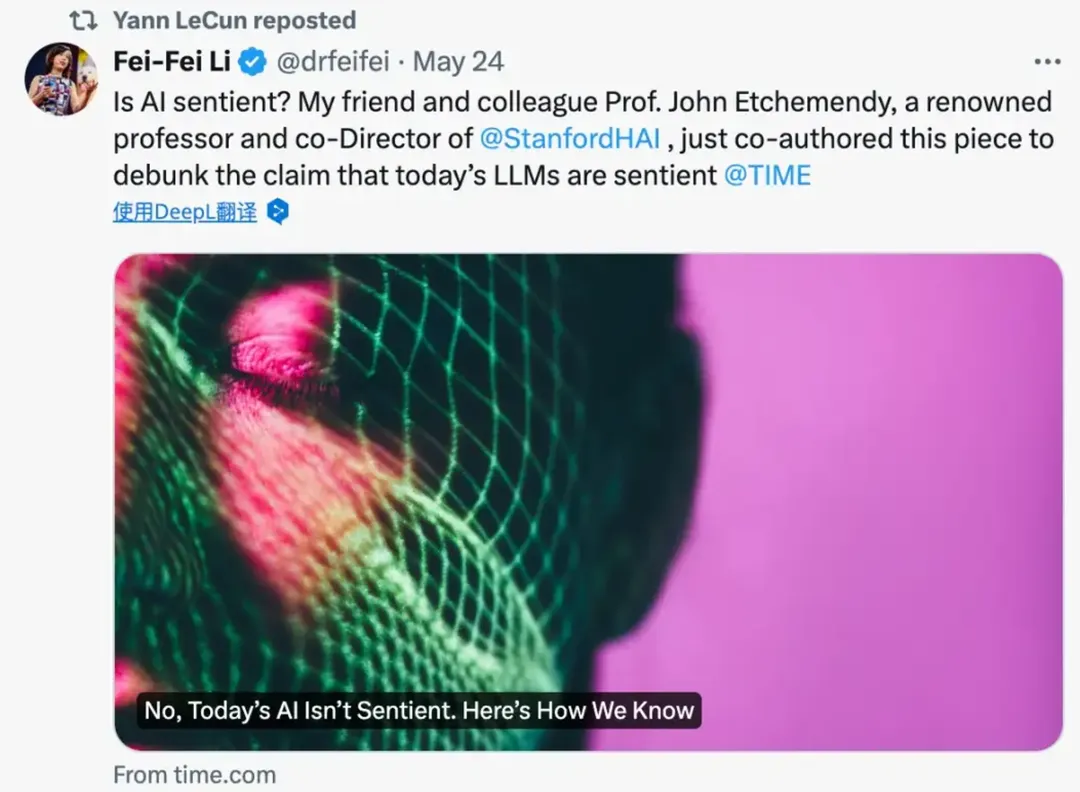 一直以来,很多人都认为GPT这种模式其实最后是通向不了AGI的。比如像之前李飞飞和Etchemendy(斯坦福哲学教授,曾任斯坦福大学教务长)在《时代(Time)》上刊载新文章《No, Today’s AI Isn’t Sentient. Here’s How We Know》,明确指出当前技术路线无法制造有感知能力的AI。