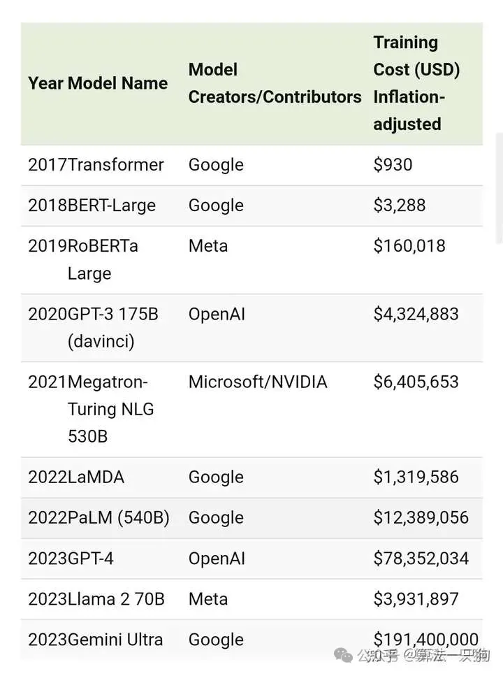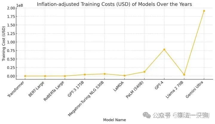 从上面图可以看出,2017年的时候训练一个transformer仅仅需要930美元,但是到训练GPT4训练模型则翻到了70000多倍的成本。也就是模型结构越复杂,其训练成本也会指数级增长。特别是对于两个巨无霸GPT-4和GEmini Ultra来说,这两个模型的费用简直一骑绝尘。