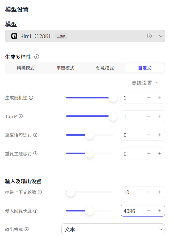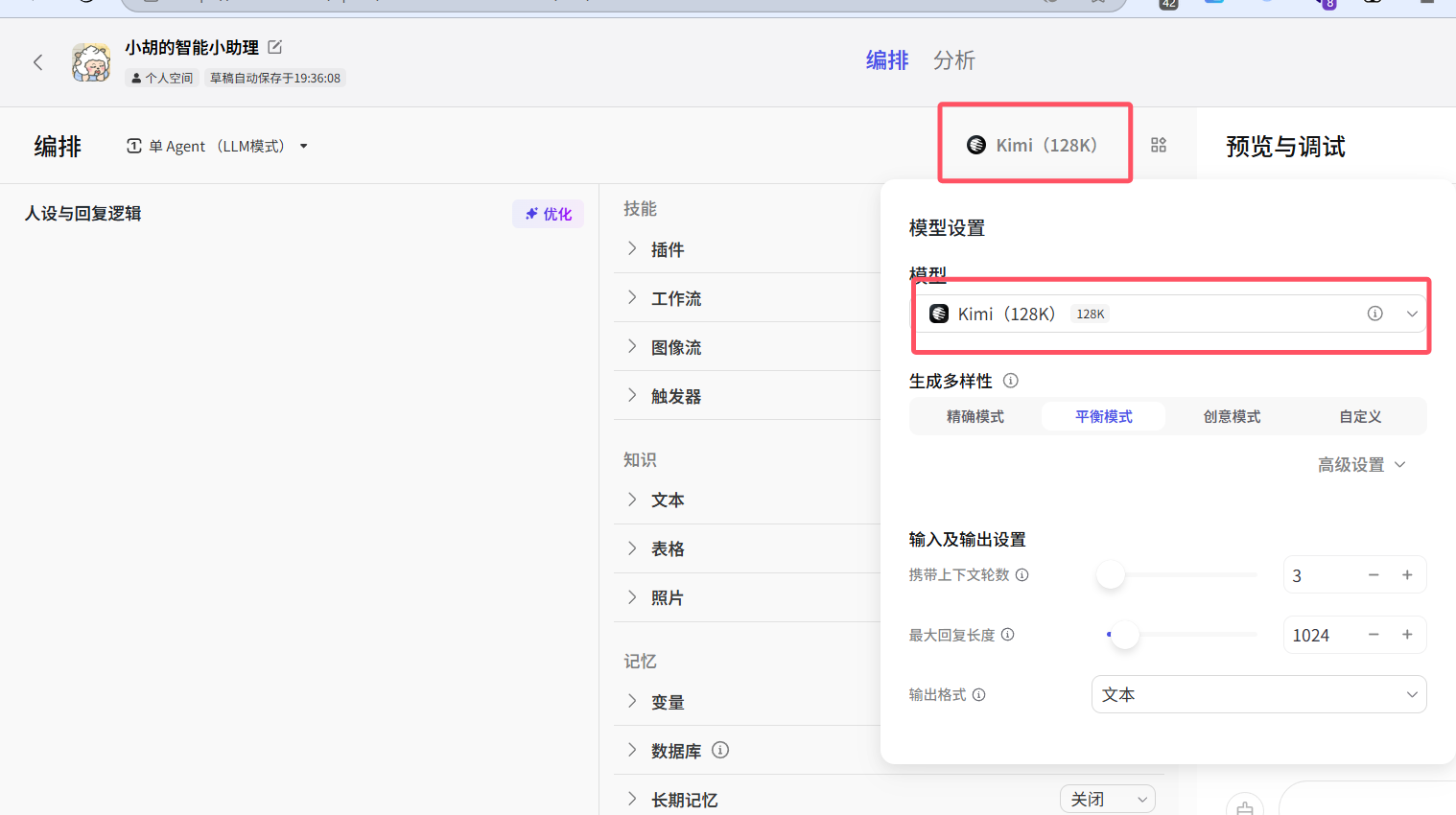 点击“模型设置,选择“moonshbot(128k)”选项,这个代表kimiai模型