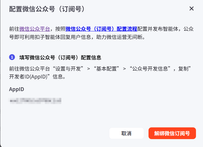 选择“配置”按钮,填写你的公众号AppID进行保存,需要使用微信扫描二维码进行授权。授权成功后,你的公众号将与Coze平台的Bot机器人关联上。