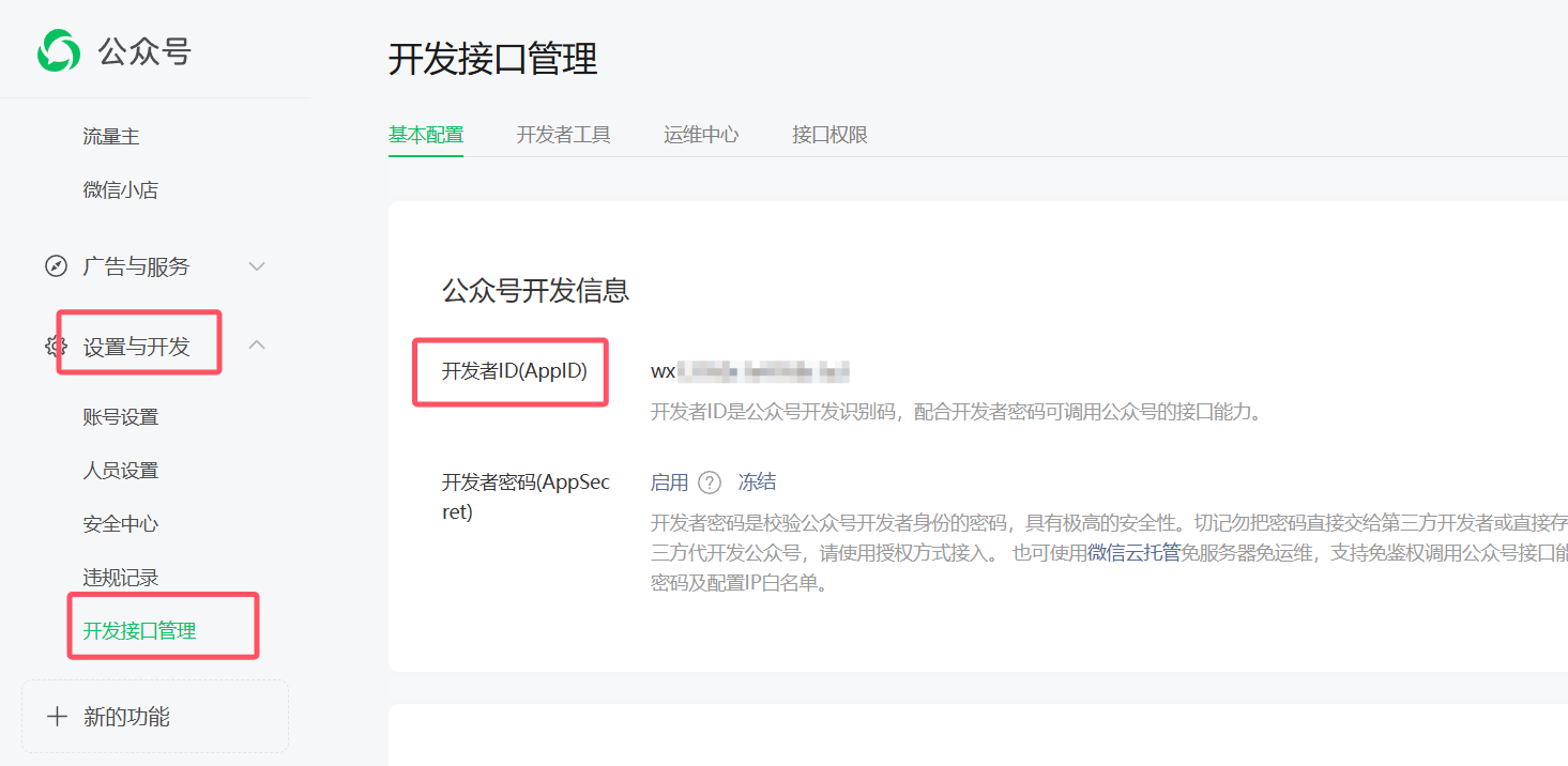 3.公众号的APPID:这是微信公众号开发的唯一标识。用于开发身份识别,在公众号后台“设置与开发”选项下的“开发接口管理中可以找到”。