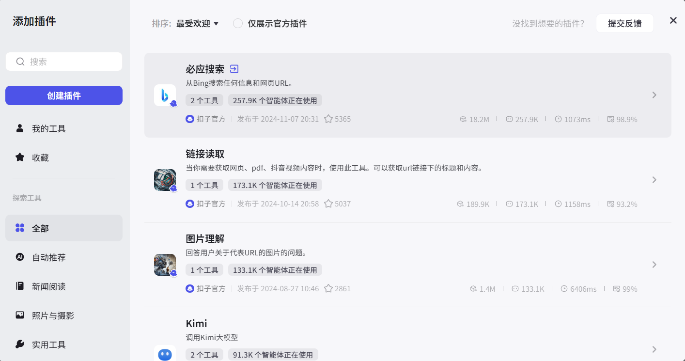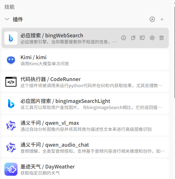 然后添加所需的功能插件,如搜索、文件阅读等,还可以添加插件对机器人的能力进行拓展。