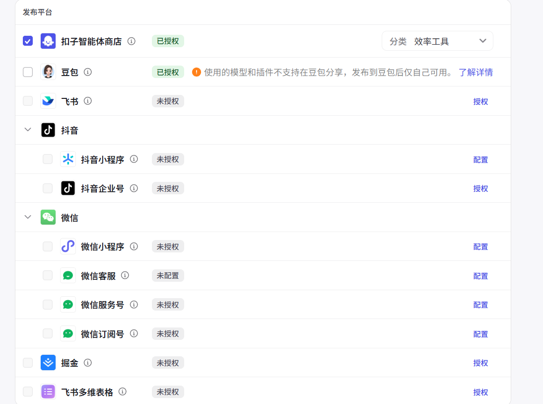 配置完成后,点击右上角的“发布”按钮发布机器人,在发布平台选项中,可以看到微信公众号选项后显示“未授权”。