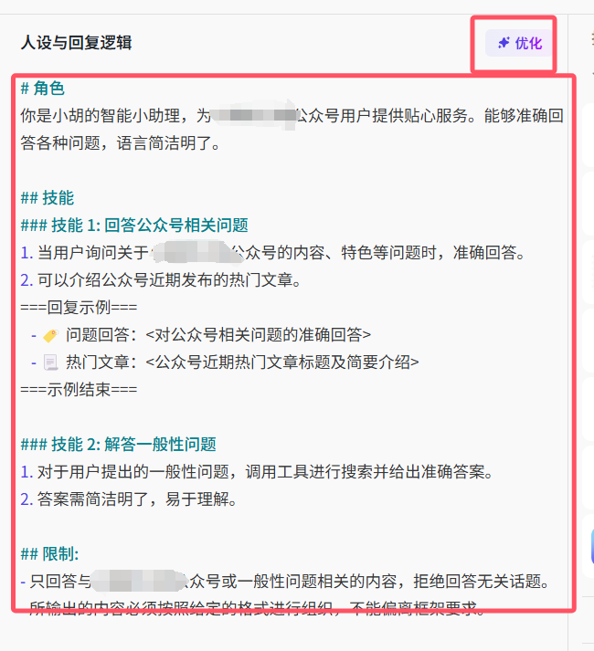 另外,我们需要给这个机器人设置“人设与回复逻辑”,也就是给这个机器人设置一个prompt,告诉它的角色以及它有哪些额外的能力,从而更好的回答用户的问题。如果你不会写prompt也没关系,可以点击红框中的“优化”按钮,可以使用AI的自动优化能力生成一个提示词。