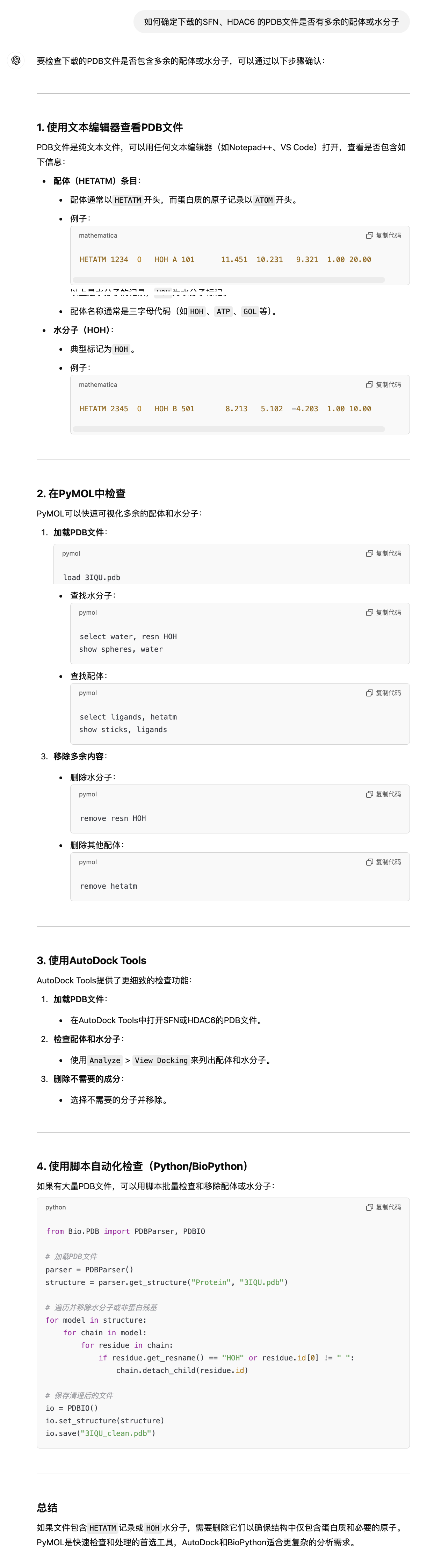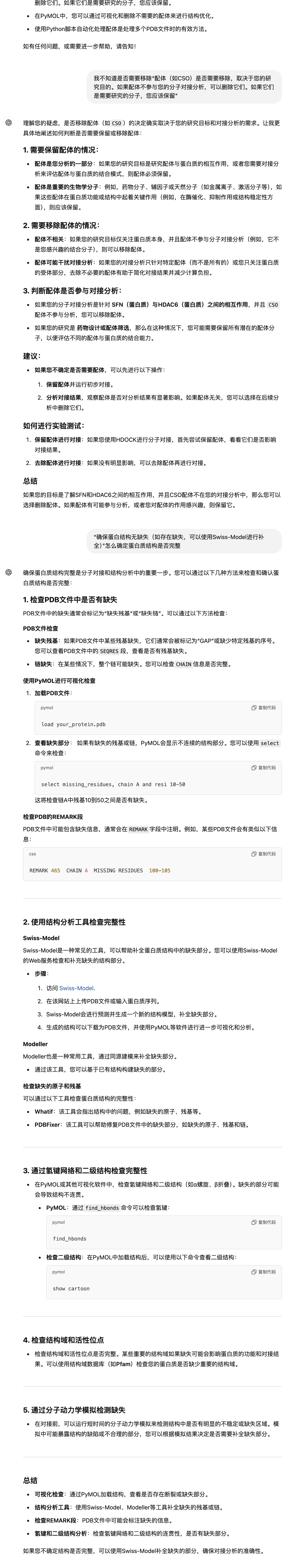 这是我上一篇分子对接帖子的实现思路,但是是有问题的,在 选择构象的时候,未关注到结构的完整性,在分子对接前需要对分子进行处理,如去除多余配体,水分子等,再进行分子对接 。