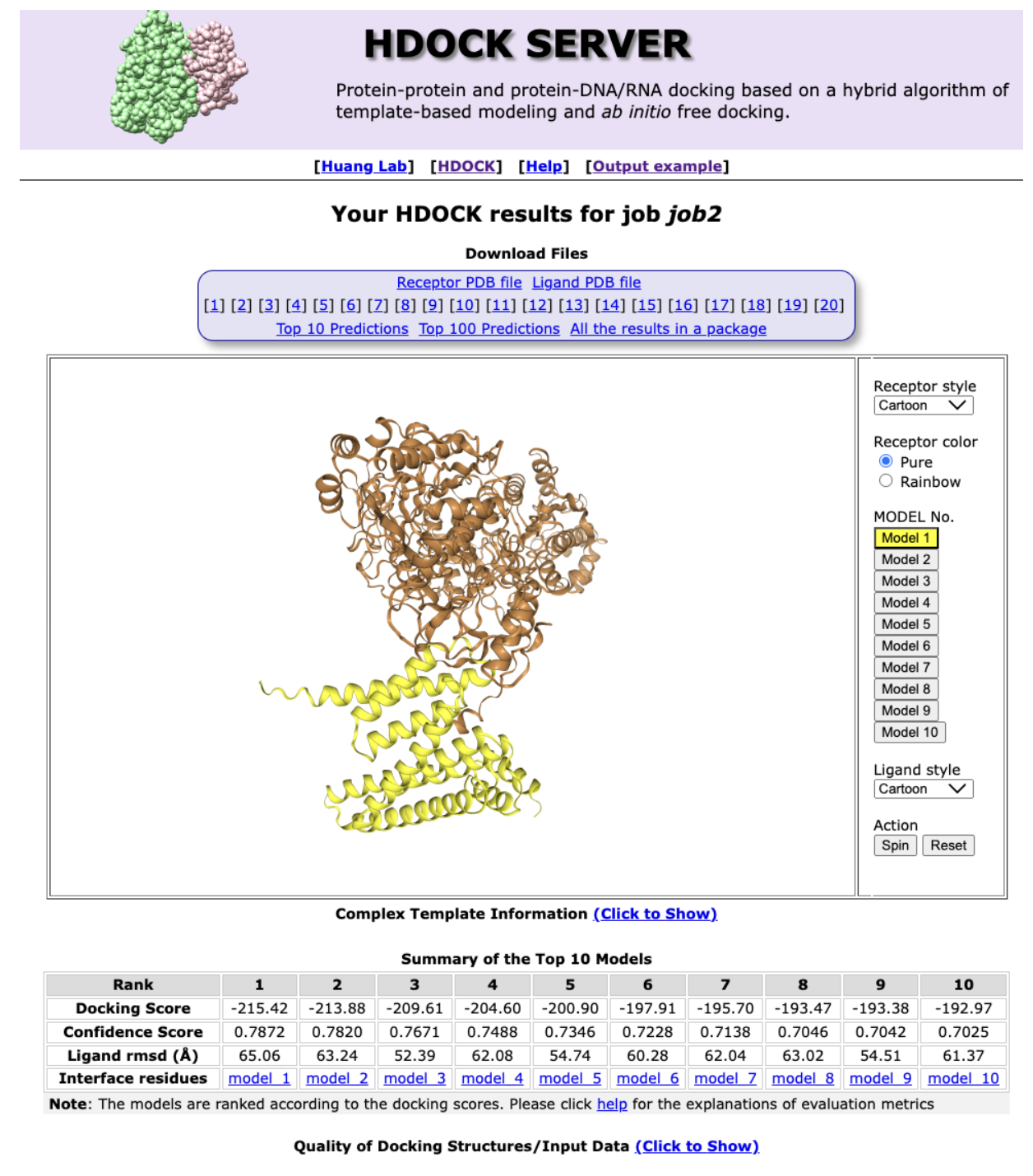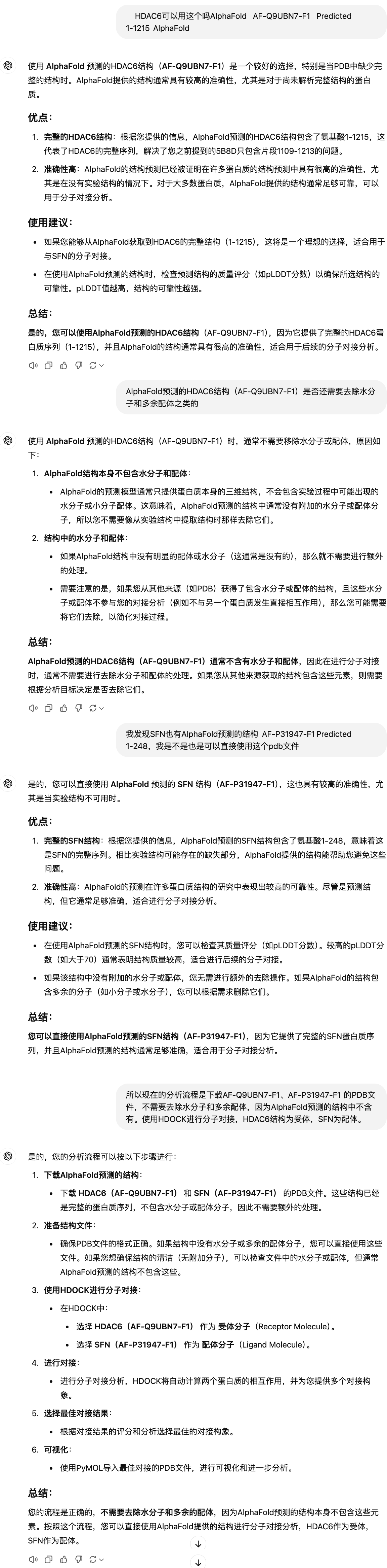 现在的分析流程是下载AF-Q9UBN7-F1、AF-P31947-F1 的PDB文件,不需要去除水分子和多余配体,因为AlphaFold预测的结构中不含有。使用HDOCK进行分子对接,HDAC6结构为受体,SFN为配体。