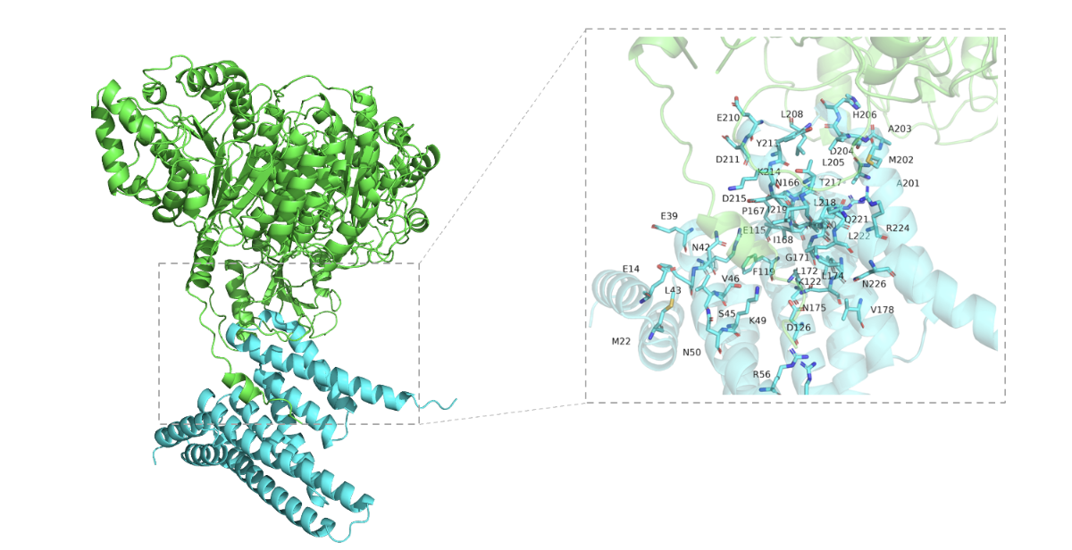 将RANK1 导入pymol进行可视化,主要操作是现实受体的5A活性口袋,然后把对应的棍状结构和氨基酸残基显示即可。