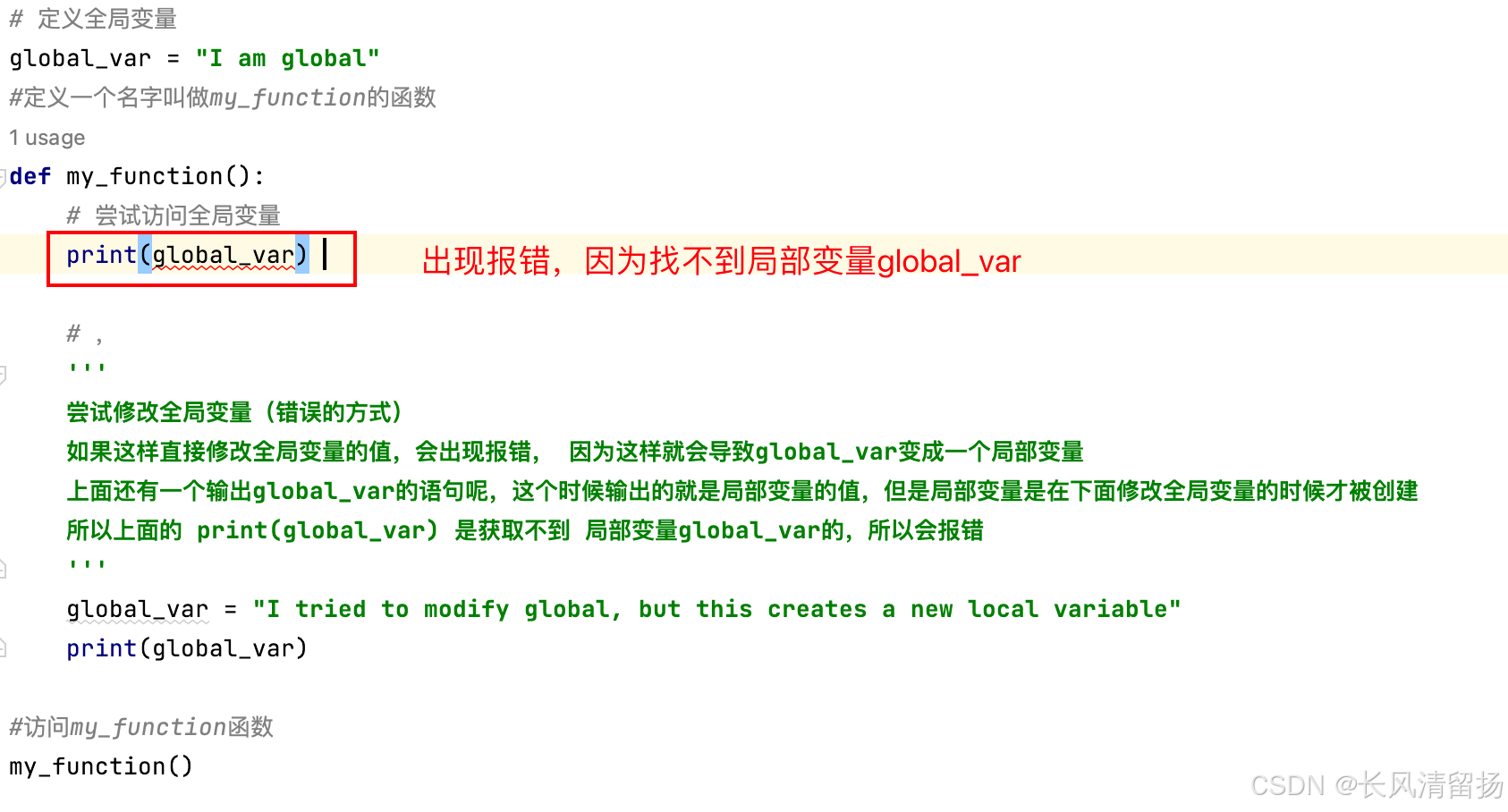 print(global_var) # 输出: I was modified globally注意,如果在函数内部使用global关键字声明全局变量的话,最好要在函数的最开始进行使用,例如global 声明了global_var全局变量,但是在声明之前,global_var就在函数中被使用到了,就会出现报错的。