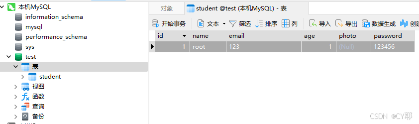 创建表student后随便添加一条数据