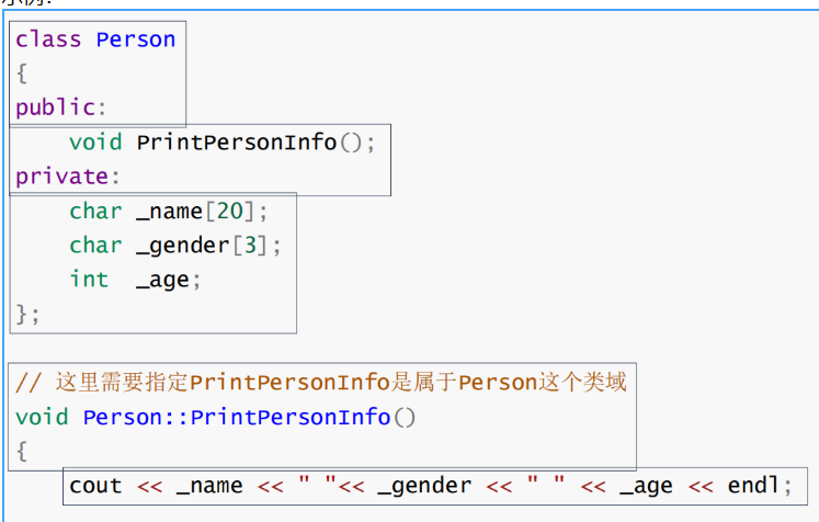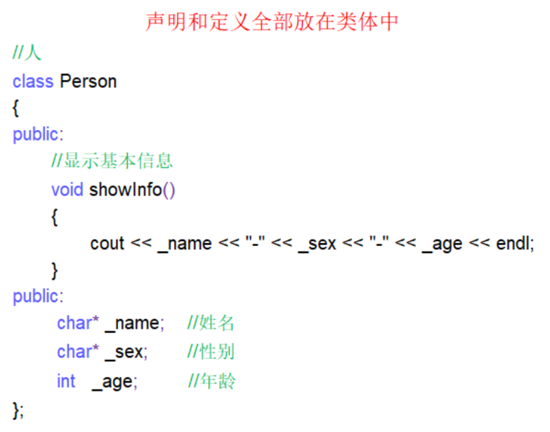 如图,我们定义了一个叫Person的类,void PrintPersonInfo();是类成员函数的声明,而此成员