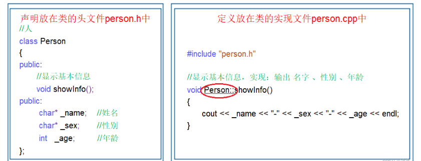 2. 类声明放在.h文件中,成员函数定义放在.cpp文件中,注意:成员函数名前需要加类名::