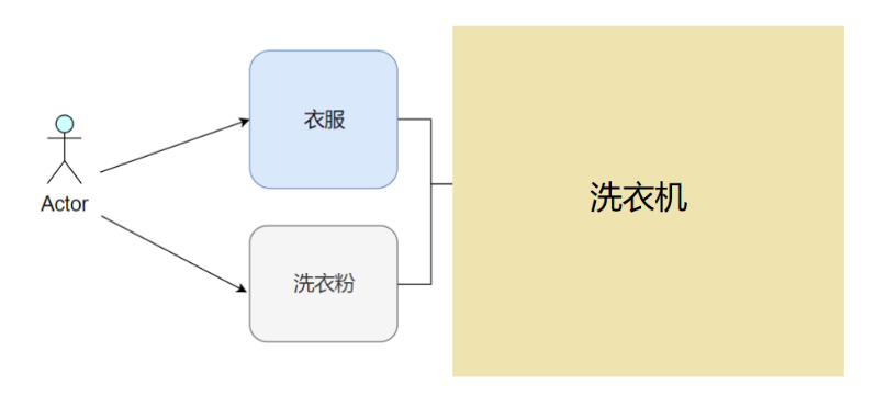 整个洗衣服的过程:人将衣服放进洗衣机、倒入洗衣粉,启动洗衣机,洗衣机就会完成洗衣过程并且甩干