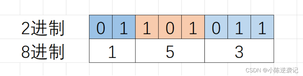 8进制的数字每⼀位是0~7的,0~7的数字,各⾃写成2进制,最多有3个2进制位就⾜够了,⽐如7的⼆ 进制是111,所以在2进制转8进制数的时候,从2进制序列中右边低位开始向左每3个2进制位会换算⼀ 个8进制位,剩余不够3个2进制位的直接换算。