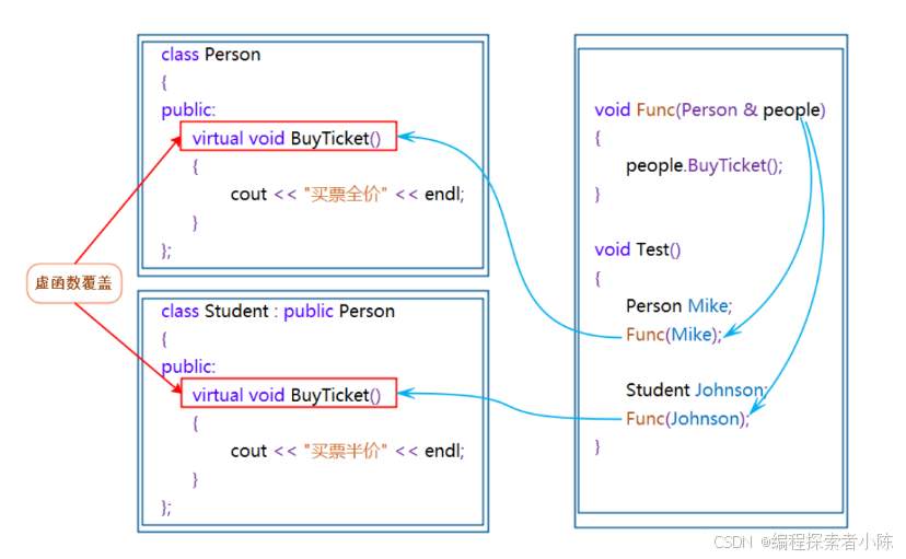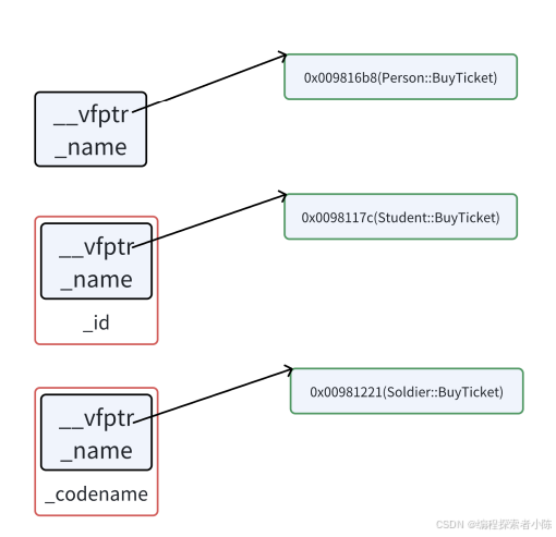 }从底层的⻆度Func函数中ptr->BuyTicket(),是如何作为ptr指向Person对象调Person::BuyTicket, ptr指向Student对象调⽤Student::BuyTicket的呢?通过下图我们可以看到,满⾜多态条件后,底层 不再是编译时通过调⽤对象确定函数的地址,⽽是运⾏时到指向的对象的虚表中确定对应的虚函数的地址,这样就实现了指针或引⽤指向基类就调⽤基类的虚函数,指向派⽣类就调⽤派⽣类对应的虚函数。