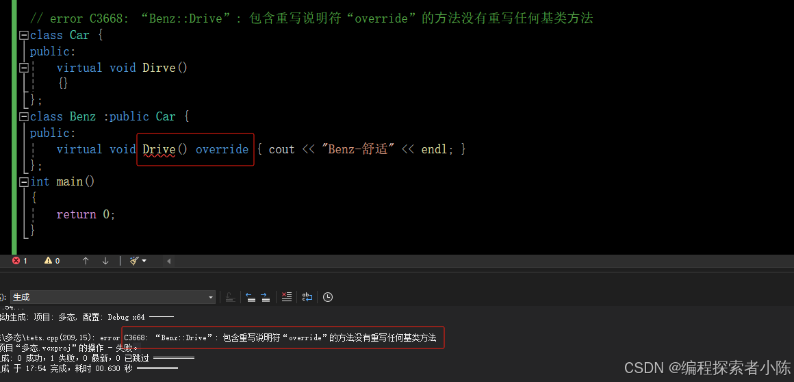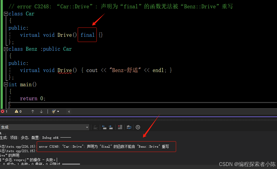 从上⾯可以看出,C++对函数重写的要求⽐较严格,但是有些情况下由于疏忽,⽐如函数名写错参数写 错等导致⽆法构成重载,⽽这种错误在编译期间是不会报出的,只有在程序运⾏时没有得到预期结果才来debug会得不偿失,因此C++11提供了override,可以帮助⽤⼾检测是否重写。如果我们不想让派⽣类重写这个虚函数,那么可以⽤final去修饰。