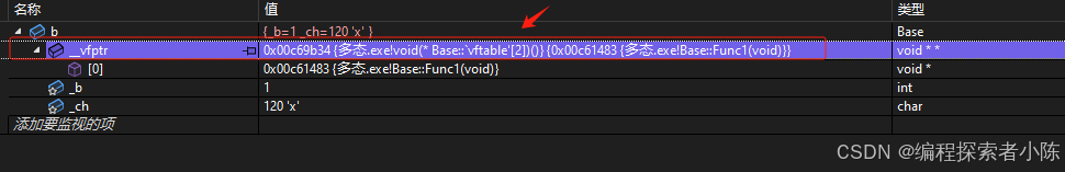 除了_b和_ch成员,还多⼀个__vfptr放在对象的前⾯(注意有些平台可能 会放到对象的最后⾯,这个跟平台有关),对象中的这个指针我们叫做虚函数表指针(v代表virtual,f代 表function)。⼀个含有虚函数的类中都⾄少都有⼀个虚函数表指针,因为⼀个类所有虚函数的地址要被放到这个类对象的虚函数表中,虚函数表也简称虚表。