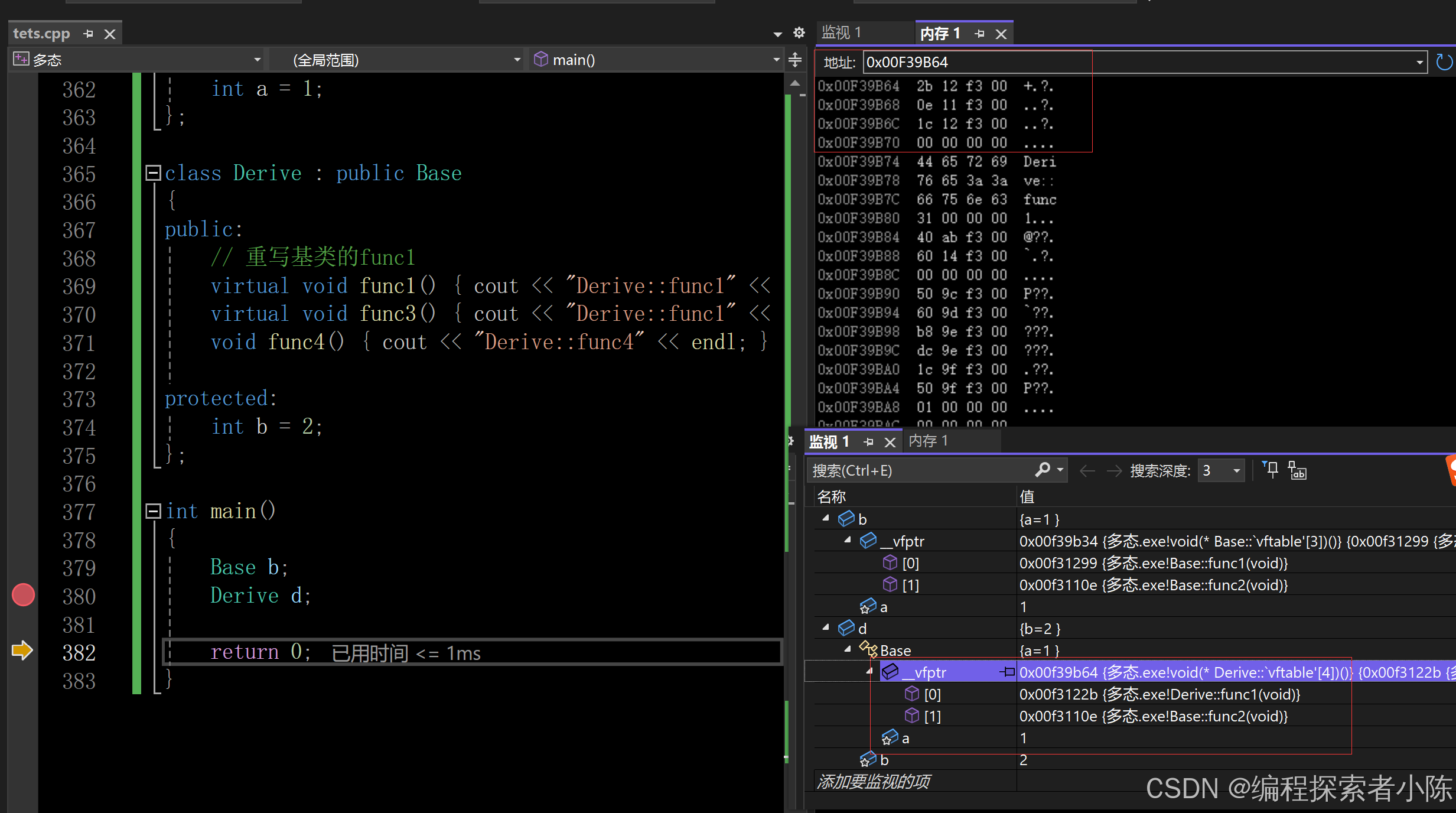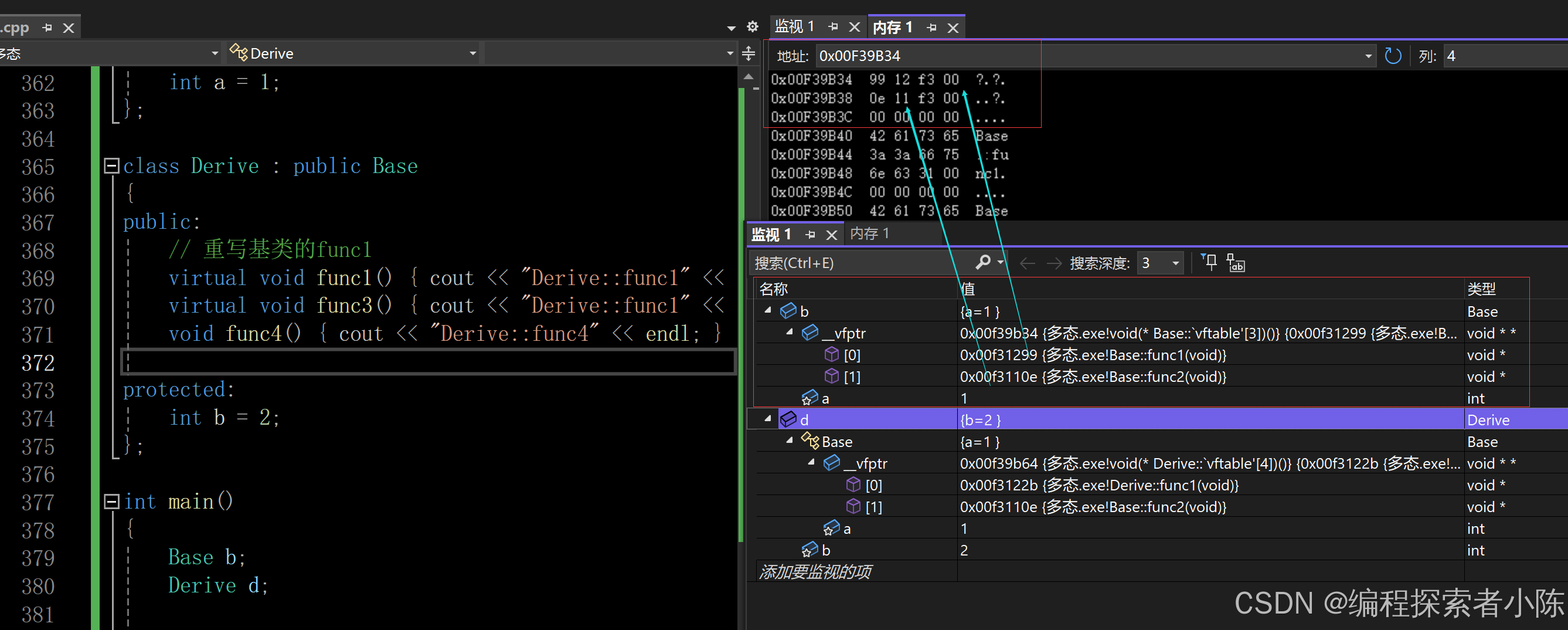 // ptr是指向对象的指针,BuyTicket是虚函数,满足多态条件。 // 这⾥就是动态绑定,编译时运行时到ptr指向对象的虚函数表中确定调用函数地址 ptr->BuyTicket(); 00EF2001 mov eax, dword ptr [ptr] // 将ptr指向的对象的地址加载到eax寄存器中 00EF2004 mov edx, dword ptr [eax] // 从eax中取出对象的虚函数表的地址,加载到edx寄存器中 00EF2006 mov esi, esp // 将当前栈指针(esp)保存到esi寄存器,可能用于调用时的参数管理 00EF2008 mov ecx, dword ptr [ptr] // 将ptr的值(对象地址)加载到ecx寄存器中 00EF200B mov eax, dword ptr [edx] // 从edx中获取虚函数表中的函数指针,加载到eax寄存器中 00EF200D call eax // 调用eax寄存器中存储的函数指针,实际调用的是对象的虚函数实现 // BuyTicket不是虚函数,不满足多态条件。 // 这⾥就是静态绑定,编译器直接确定调用函数地址 ptr->BuyTicket(); 00EA2C91 mov ecx, dword ptr [ptr] // 将ptr指向的对象的地址加载到ecx寄存器中 00EA2C94 call Student::Student (0EA153Ch) // 直接调用Student类中的BuyTicket函数,使用静态绑定,编译器在编译时确定了函数地址