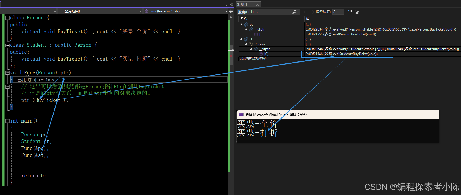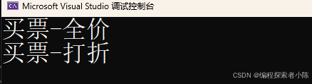 这里满足多态,student类继承了Person类,student类重写了基类的函数也就是BuyTicket()方法,输出内容为“买票-打折”。