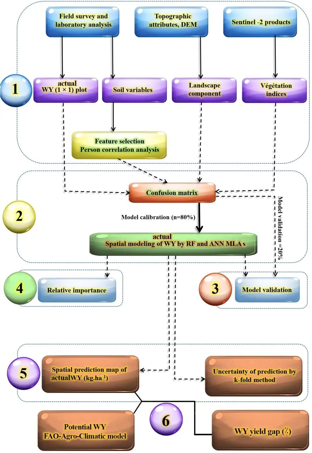 Mousavi等人通过整合土壤和环境因素与ML预测小麦产量,解决了产量预测的挑战。通过整合土壤属性、地形特征和植被指数,他们的研究应用RF和人工神经网络(ANNs)绘制实际小麦产量,展示了ML在优化农业生产中的潜力。