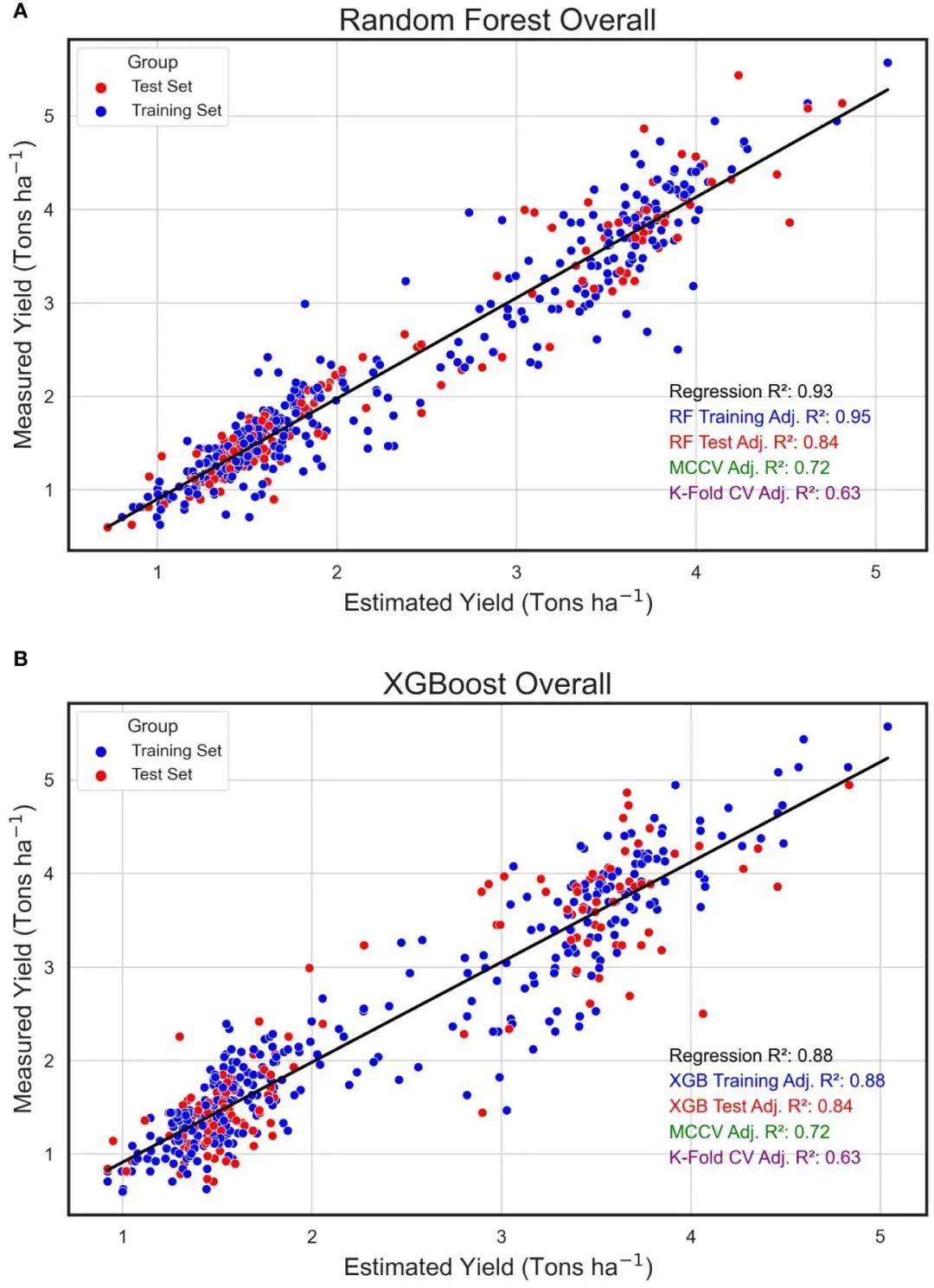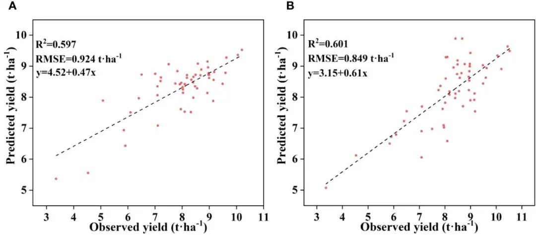 如图是机器学习模型预测的地块级产量值(吨/公顷)与将两年的研究结果结合起来后在田间测量的实际产量(测量产量)之间的线性回归。使用的机器学习模型包括随机森林(RF,A)和 XGBoost(XGB,B)。